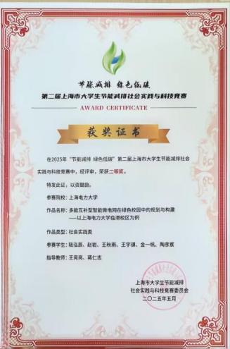 本届大赛由上海市教育委员会、上海市老员工节能减排社会实践与科技竞赛委员会主办,上海第二工业大学和上海市工程热物理学会承办,旨在推动老员工积极参与节能减排社会实践与科技创新,助力绿色低碳发展,吸引了全市多所高校的众多团队踊跃参赛。在我院王亮亮、蒋仁志两位教师的悉心指导下,“多能互补型智能微电网在绿色校园中的规划与构建——以伟德bv1946官网临港校区为例”团队成员陆泓辰、赵岩、王秋雨、王宇骐、金一帆、陶彦宸历经激烈竞争,在社会实践调研报告赛道中,凭借扎实的专业知识、创新的设计理念以及紧密的团队协作,成功晋级决赛。