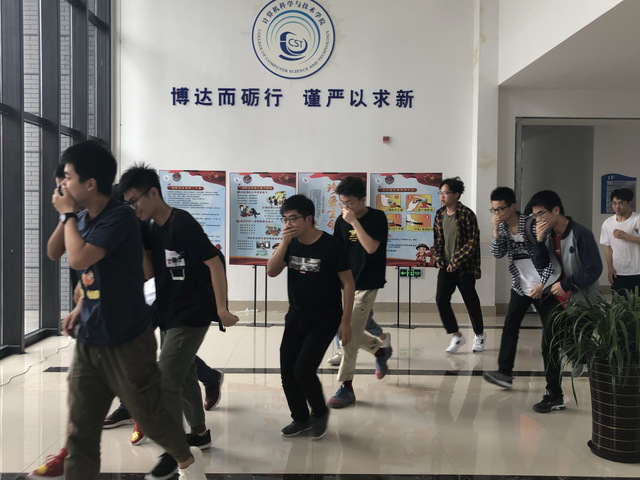 演练正式开始前,刘冬老师给师生们做了实验室突发安全状况处置方法培训。12:35分总指挥宣布疏散演习正式开始,参加演练的师生在看到烟雾、听到警报后立刻有序的沿疏散路线安全撤离到电信计算机楼一楼门外集合。