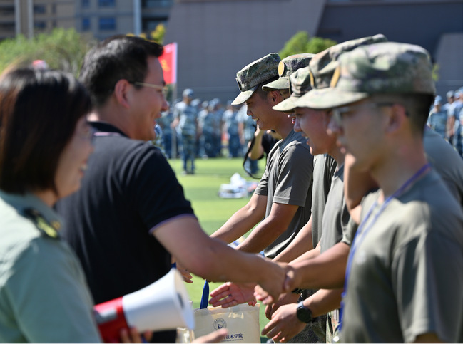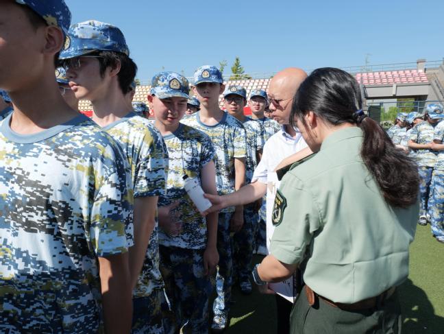 在慰问新生环节,领导们将精心准备的运动饮料递到新生手中,并细致了解同学们的训练情况,叮嘱同学们注意防暑降温,保持身心健康。