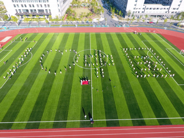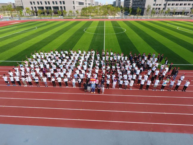 其次,56名同学手举小国旗围成同心圆,同心圆中央五星红旗迎风飘扬,象征56个民族团结在一起,同心共筑中国梦。之后队伍变换成“我爱中国”字样,运动赛场,青春的我们为祖国祝福!