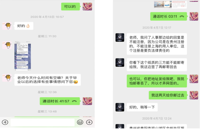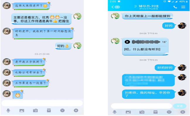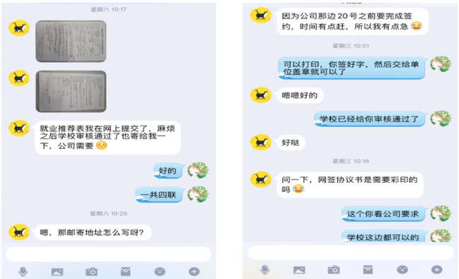 毕业班辅导员刘佳,在疫情期间及时帮助员工了解网签流程,协助邮寄纸质版三方协议、网签纸质版、就业推荐表等就业相关材料,同时帮助员工办理留学所需相关材料,并热心回答、解决同学们学业、就业方面遇到的各种问题。