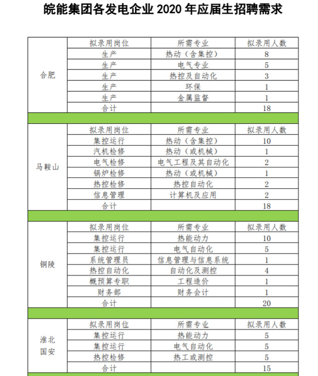 ★特别注意:本招聘公告除我单位官方主页及宣讲所到 院校官方网站上发布外,不在其他院校及商业网站发布。 皖能集团各发电企业 2020 年应届生招聘需求