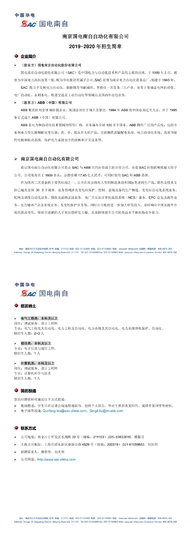 【招聘信息】191-202006南京国电南自自动化有限公司招生