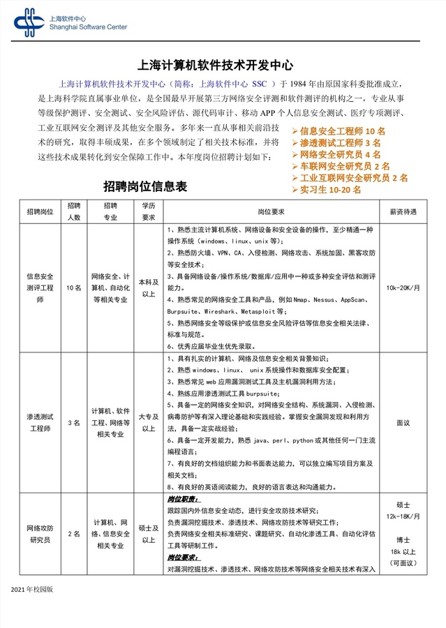 【招聘信息】253-202111上海软件中心招聘