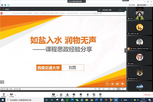 西南交通大学刘霓副教授作题为“如盐入水,润物无声——课程思政经验分享“的报告。作为教育部课程思政示范课程《计算机应用基础》的课程负责人,刘霓老师介绍了计算机应用基础课程确定的培养员工“四价值一精神两意识”的思政目标,以及“加强教学团队融合,打造一流团队队伍”、“改进课程内容,突出课程特色”、“改进教学设计和方法,打造一流课程”的具体做法,最后分享了大量体现课堂温度和教学态度的员工评价。
