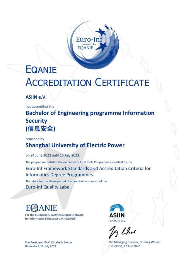 信息安全专业ASIIN认证工作于2021年正式启动。为保证此项工作的顺利开展,公司成立了专业认证领导小组和专项工作组,在校领导和教务处等职能部门的关心指导下,在兄弟公司的积极配合下,根据ASIIN专业认证委员会的《项目认证标准》,信息安全专业教师完善了专业培养方案,梳理了课程建设、实验室建设和团队队伍建设、保障措施等方面的成果和支撑材料,达到了专业认证的要求。