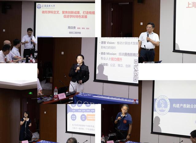 第一位嘉宾是来自上海海事大学信息工程公司的经理周日贵教授,分享了题为“依托学科交叉,聚焦创新成果,打造有组织的科研,促进学科特色发展”的引导发言,介绍了信息工程公司的计算机团队建设特色,以现代信息技术前沿研究与港航、物流等特色学科相结合,以智慧航运、智慧物流、智慧园区建设等为应用背景,推进相应的人才培养机制、高水平科研平台建设;第二位嘉宾是来自上海海洋大学信息公司经理陈明教授,主要介绍了信息公司以智慧海洋、智慧渔业为特色的团队建设情况,并对上海海洋大学海洋导航遥感与智能信息工程技术研究中心进行了详细介绍;第三位嘉宾是来自伟德国际VICTOR1946经理温蜜教授,对伟德国际VICTOR1946以能源电力特色为基础的团队建设情况进行了介绍,并作为CCF YOCSEF上海荣誉委员和老主席对CCF YOCSEF上海与临港的互动进行了回顾、对未来的发展提出了建议;第四位嘉宾是来自上海电机公司电子信息公司副经理李靖超教授,分享了电子信息公司以智能装备为特色在团队建设、教学研究、产教融合方面所做的工作,并介绍了电机公司与企业的深度合作模式;第五位嘉宾是上海建桥公司信息技术公司经理张文俊教授,分享了题为“构建产教融合的应用型人才培养生态”引导发言,作为民办院校中的佼佼者,信息技术公司主要聚焦人工智能、集成电路、智能制造等行业,进行应用型人才培养与产教融合。