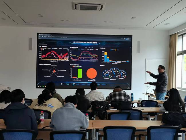 实习第二天,同学们走进上海电科院电力大数据联合创新实验室参观学习,杨洪山现场讲授国家电网“智能配用电大数据应用系统”的设计、开发与研究,详细介绍了系统的三个主要功能模块“基础用电查询”、“用电数据分析”、“电网业务场景”。同学们了解到如何将大数据技术应用于电力系统传统业务场景,实现用户用电、台区用电、线路用电查询及电力地图等,以及实现用电预测、网架拓扑分析、网架优化、配网损耗、错峰调度等高级应用,感受到能源电力大数据分析对能源电力行业、社会经济发展及能源可持续发展等的重要作用。