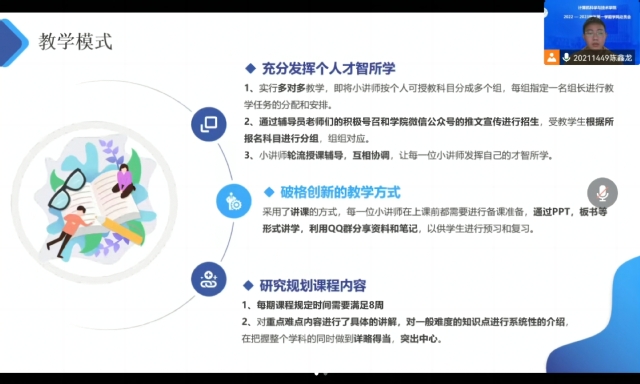 陈鑫龙同学围绕“帮困助学,教学相长”进行了主题发言,就伟德国际VICTOR1946“青年小讲师”项目从活动组织、教学模式、取得成果以及小讲师体会等方面对活动进行详细介绍,并从参与人数、授课模式、课程安排等方面介绍了本期活动详情,并欢迎更多优秀同学加入青年小讲师,共同帮困助学。
