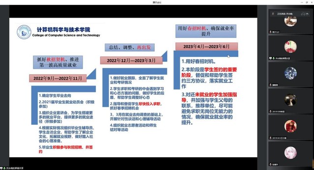 徐曼详细介绍毕业班教学工作安排,着重强调如何做好学业管理,关注学分和绩点是否符合毕业相关要求;提醒同学们注意毕业设计的要求,关注毕业设计系统及教务系统的选课,要保持与老师之间的联系,处理好毕业设计与实习的关系;根据不同专业的实习安排,提醒同学们在规定时间内完成毕业实习等,确保顺利按时毕业。