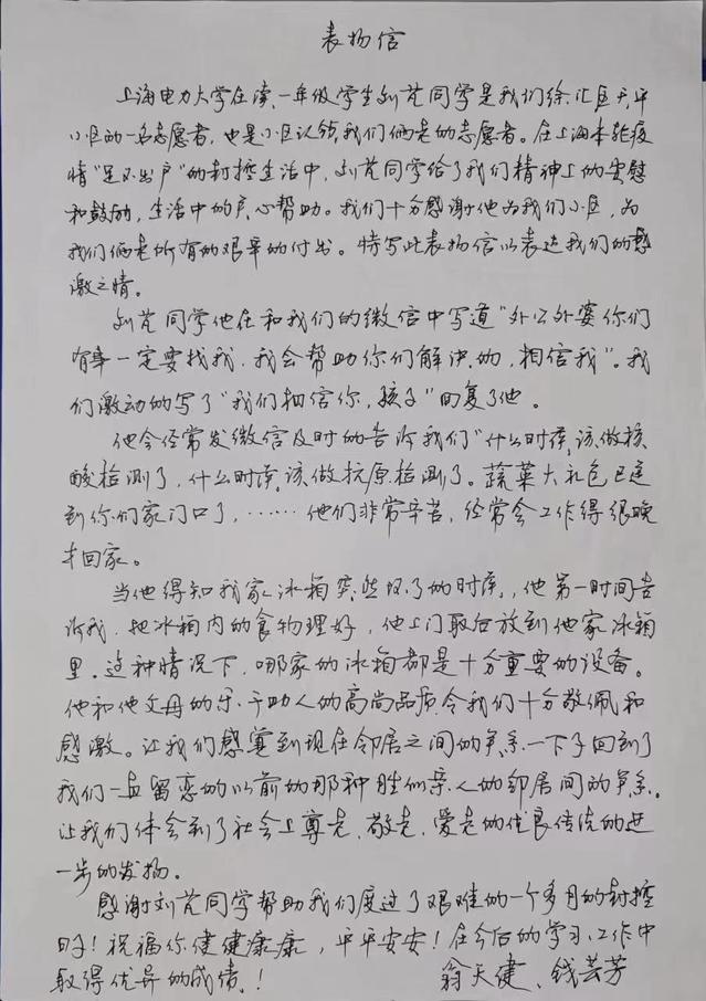 疫情期间,刘芃同学积极认领成为翁天健和钱芸芳两位老人的对接志愿者,在生活上给予他们力所能及的帮助,在精神上给予他们安慰和鼓励,每当他们需要的时候都能及时给予帮助,深受翁爷爷和钱奶奶的喜爱,并以表扬信的形式给予肯定。