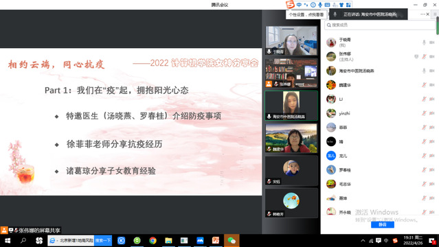 我们在“疫”起,拥抱阳光心态。工会特别邀请了汤晓燕和罗春桂两位医生介绍防疫注意事项,为教师们解答居家隔离和做核酸过程中的担忧疑惑。汤医生自疫情以来一直在抗疫前线支援,罗医生更是亲历了新冠病毒,她们都从专业的角度为大家讲解和分享了防疫知识和技能,也让大家对新冠病毒的危害有了更加深刻的认识,并提醒大家注意细节,做好防护。徐菲菲老师也分享了自己感染新冠的亲身经历,在隔离和治疗的过程,菲菲老师非常勇敢、高度配合,短短数日便恢复正常,她积极乐观的精神深深地感染了所有人。