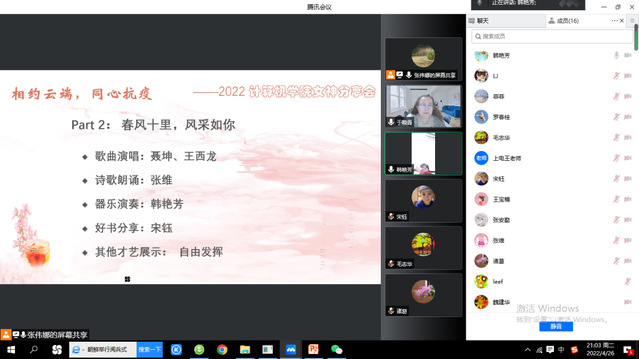 新冠病毒的再次变异和快速传播扰乱了我们的日常生活也改变了我们的工作方式。为了提升女教师的防疫抗疫能力、缓解居家隔离压力, 4月26日晚7点,伟德国际VICTOR1946工会组织女教师们开展了以“相约云端,同心抗疫”为主题的分享、交流活动。鼓励大家拥抱阳光心态,展示女性风采,丰富居家隔离生活。