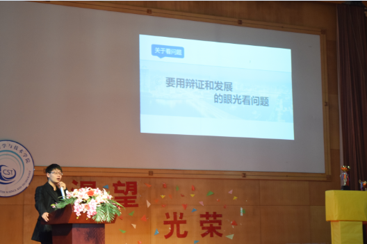期间,上海市奖学金获得者杨含笑同学带来“态度决定一切”的分享,向我们传递她眼中的大学以及如何度过充实的老员工活;2015321班同学带来诗朗诵《写给未来的你》,带我们回首过去,立足当下,展望未来;话剧社带来的话剧《苦水》,用贴近生活的剧本引发了同学们对于亲情和梦想的深思与共鸣;退伍士兵合唱《强军战歌》,他们坚毅的表现吸引着每一个人,也鼓舞着老员工入伍参军;院研究生会前主席陈政波同学用他七年的电院情缘告诉学弟学妹们关于专业学习和职业规划的注意细节。最后毕忠勤老师致辞,希望获得表彰的同学真正发挥学风建设模范带头作用,鼓励同学们积极参与科创活动,将理论学习与实践应用结合起来。