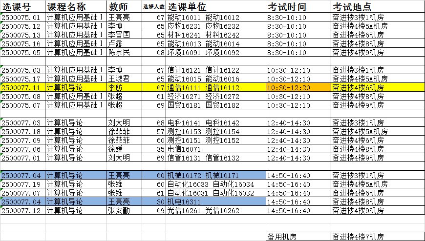 本学期小学期进行的计算机应用基础I、计算机导论课程已经结束,定于11月20日进行考试,请相关老师和同学查看考试安排,具体如下: