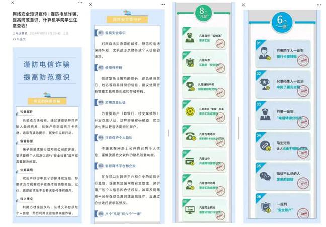 在反诈主题教育中,伟德国际VICTOR1946“E路领航”辅导员工作、“计E网安”网络安全实践队、白帽子网路攻防社等多个团队共同携手,做到线上和线下全方位,本科和研究生全覆盖,通过系列反诈教育活动,让员工们对电信网络诈骗有了更深刻的认识,提高了员工对电信网络诈骗的警惕意识、防范意识,增强了法制观念,取得良好的效果。